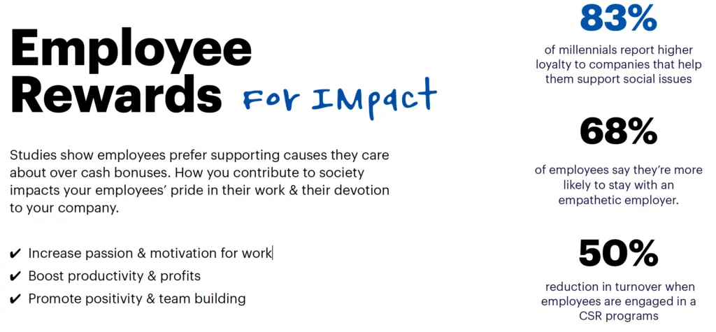 Our Evolved Employee Rewards™ program provides an opportunity for every employee to make a charity donation to a cause they care about which has been shown to improve productivity, engagements and passion at work. (See below for more details)